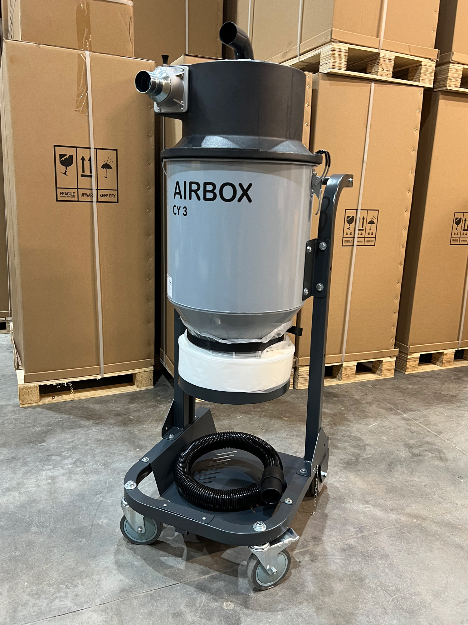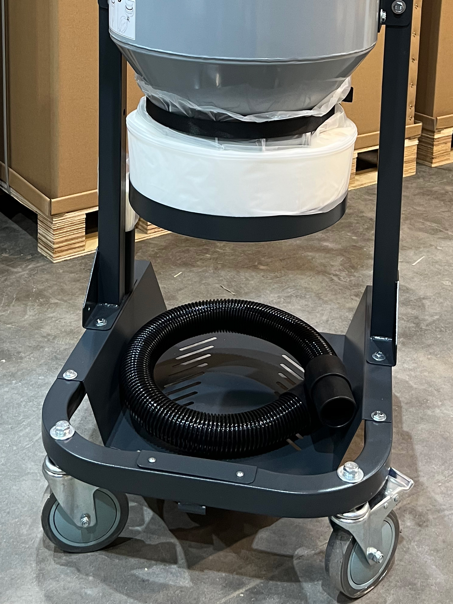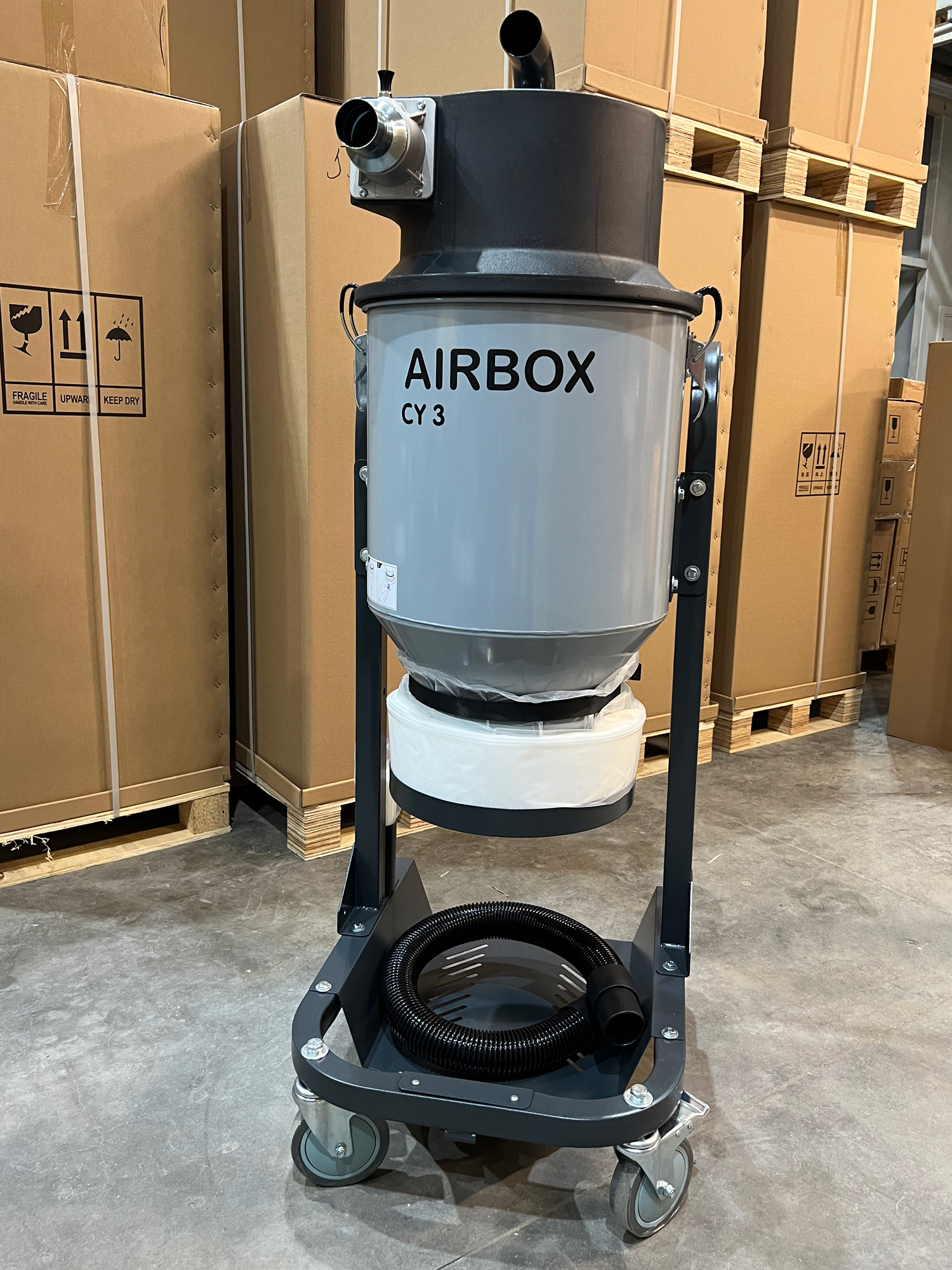 Передвижной предварительный сепаратор циклонного типа - подключается к промышленным пылесосам, отделяет мелкие и легкие частицы от потока воздуха до того, как они достигнут основного контейнера или фильтра.